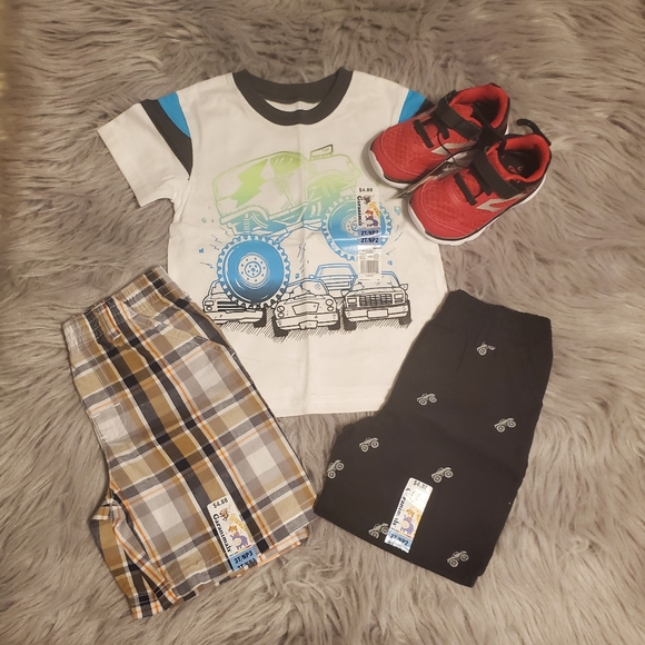 Adorable bundle for boys includes a monster truck shirt size 2T, matching monster truck shorts size 2T, plaid shorts size 3T and tennis shoes size 8, all nwt! I have 2 of these sets available, perfect for twins!
