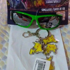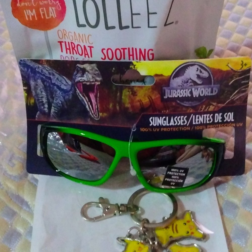 All new bundle Jurassic Park sunglasses, Pokemon keychain and a bag of LOLLeez pops for soothing sore throat