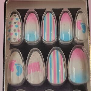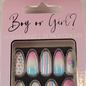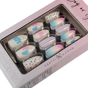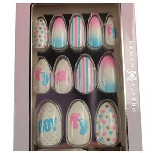 New sealed gender reveal faux nail set by Pretty Woman. Includes 24 press-on nails with boy/girl patterns in pink and blue plus 1.8mL nail glue. Great for baby showers or reveal events. Packaged and shipped carefully from a smoke-free environment.