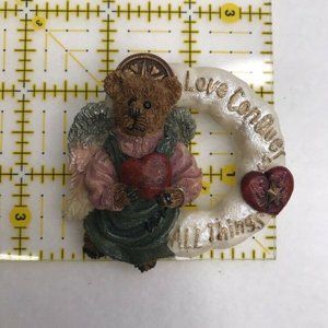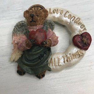 Boyd's Bear Pin from their Bearwear line. Teddy bear angel holding a Heart. The wreath cloud and heart "Love Conquers All Things" in gold. Pin is made of resin and hand painted. Standard locking pin back.