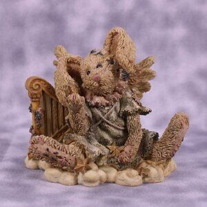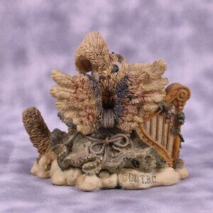 Adorable Boyds Bears & Friends figurine, style #2230 "Celeste the Angel Rabbit" from 1993. Features a detailed angel rabbit sitting among clouds, holding a harp with floral accents, and wearing a textured dress with gold stars. Excellent pre-owned condition, ideal for display or gifting.