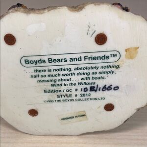 Charming bear figurine wearing a blue sweater. Perfect for collectors. Vintage from 1993. One of the earliest resin figurines in the collection. Depicts Christian in a blue anchor sweater playing with a boat in the sand. His ripped hat says HMS BOYDS.