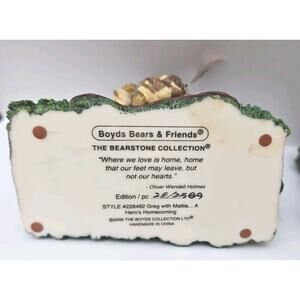 The Boyds Bears & Friends The Bearstone Collection A Hero's Welcome and Billy Bearyproud figurines are small, multicolored sculpture featuring two bears from the Bearstones collection. Manufactured in 2005 & 2006, these figurines showcase a bear character family with a heroic theme, making them a unique and collectible decorative pieces for any bear enthusiast or fan of heroes. A charming addition to any bear-themed display, this figurine captures the essence of heroism and families through their adorable design.