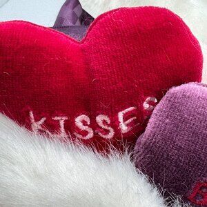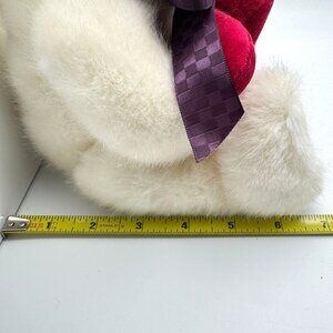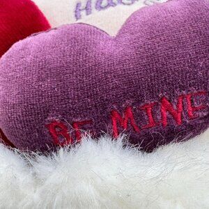 A collectible Boyds Bears plush from 1998-2002 with soft, creamy fur. Features jointed limbs, embroidered hearts reading Hugs Kisses and Be Mine, and a purple ribbon.