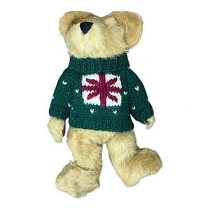 Boyds Bears Plush Casimir B. Bean, retired, vintage, gold plush bear with tan felt pads, fully jointed and bean filled, comes with two hand-knitted sweaters, one is green with gift box and bow, the other is cream with a red heart, 10", NWT.