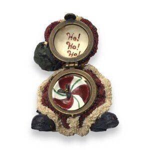 Features: The item is a detailed, hinged box with a message inscribed inside the lid. It depicts a bear dressed in a red and cream-colored Santa-style outfit, holding a small bear in its lap.