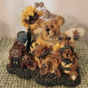 Victoria Regina Buzzbruin … So Many Flowers, So Little Time (Style #01999-71, 1999 Celebration Edition) – bee-themed bear with crown, honey pot, and bees buzzing around sunflower and hive marked “Home Sweet Home.”