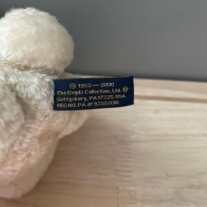 Excellent condition, no rips stains or tears. Tags still attached, jointed and weighted. 10” in hight standing up. Cream color, cute little plaid scarf and pink stitching. Vintage