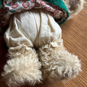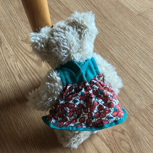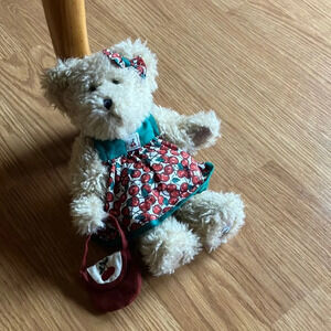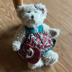 Boyds Bear The Head Bean Collection Tia Cherrybeary plush 9”. This little girl bear is dressed in her cute red cherry dress trimmed in green. She is wearing a bow in her fur hair while holding a purse that matches and beige bloomers. The dress has a Velcro closure and there’s a cherry patch on her left leg. So adorable!