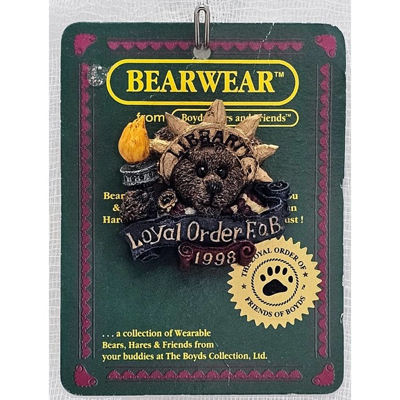 "Libearty... Loyal Order F. o. B. 1998" Pin (1998) is a delightful way to express your admiration for Boyds Bears & Friends and their timeless appeal. Whether worn as a fashionable accessory or displayed as a collectible, it captures the whimsical spirit of Boyds Bears and the joy they bring. Let it adorn your outfit and join in the celebration of the enduring charm and collectible legacy of Boyds Bears & Friends. As part of The Bearwear Collection, this pin carries the legacy of craftsmanship, whimsy, and artistry that has endeared Boyds Bears to collectors worldwide.