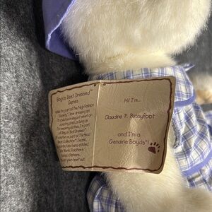 Adorable plush cat wearing a purple plaid dress and matching hat with a flower. Perfect for collectors or as a gift.Collectors