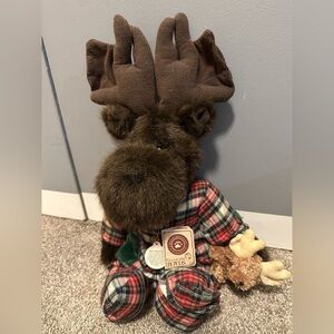 Adorable plush moose wearing a plaid outfit. Features soft brown fur and antlers. Approximately 17 inches tall.