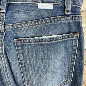 Blue jeans, rigid denim, high rise, button fly, 5 pocket styling; 70% cotton 30% recycled cotton, machine wash Pre owned, good condition, no flaws to note Approximate measurements: Waist: 17” Hips: 19” Rise: 11.” Inseam: 27”
