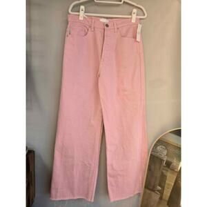 Trendy wide leg Boyish jeans in a soft pink wash. High rise with a button fly and raw hem detail. Premium denim brand known for sustainable, eco-friendly styles.