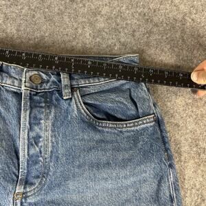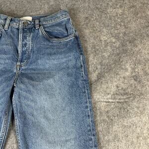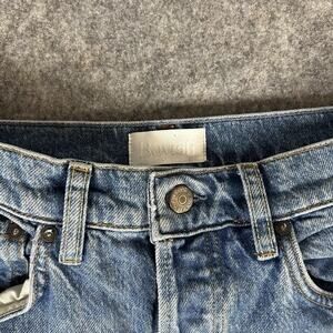 The Boyish Jeans Women's size 25 in a medium wash denim with a straight leg and raw hem design offer a stylish and comfortable fit. These button fly jeans feature a high-rise waist, 5-pocket design, and are made from stretch denim fabric for added comfort. Machine washable and suitable for all seasons, these versatile jeans are the perfect addition to any woman's wardrobe, providing both style and functionality in a classic blue color.