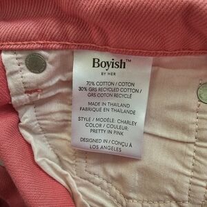 Boyish "The Charley" hugh rise rigid wide leg jeans in a salmon pink with button fly. Plant-based, organic, carbon neutral, recyclable, non-toxic!