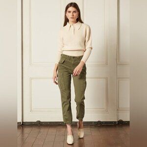 High-waisted cargo pants. 6 flap pockets - 2 front, 2 back, and 2 side. Zipper fly. 70% cotton, 28% recycled cotton, 2% elastane.
