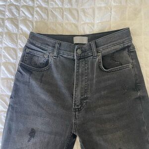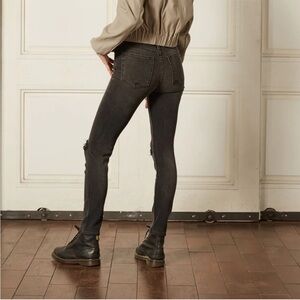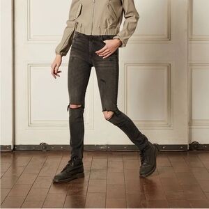 Chic black skinny jeans with distressed details. Ideal for casual wear or a night out.