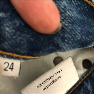 Features: High rise, straight leg, raw hem, subtle destruction, custom painted floral detail, recycled silver hardware