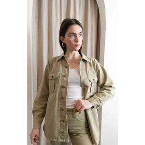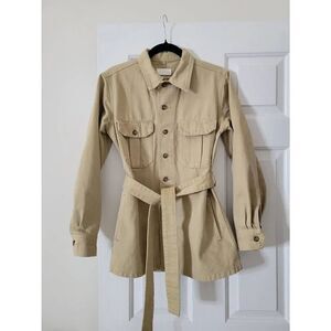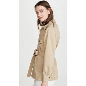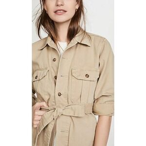 The Boyish Jeffery safari jacket is a rigid denim coat inspired by a vintage safari tour. This utility jacket features front pockets, a waist tie, tortoise shell buttons, and recycled cotton to help reduce its carbon footprint and water usage. Style yours open or closed over the matching Tommy high rise straight jean in the same vintage khaki wash.