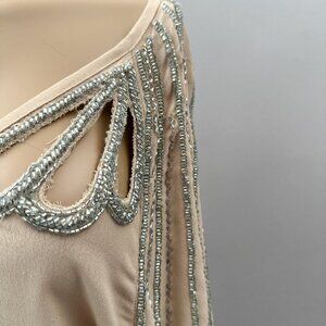 Tags: Beaded top, blouson sleeve blouse, blush pink top, silver bead blouse, women's top, lightweight blouse, embellished blouse, v-neck top, Beyond brand, made in India blouse, cut-out shoulder top, dressy blouse, women's fashion