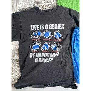 • Black "Life Is A Series of Important Choices" baseball glove tee, size 10/12