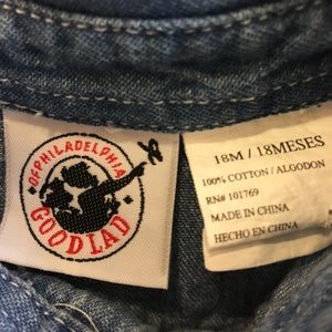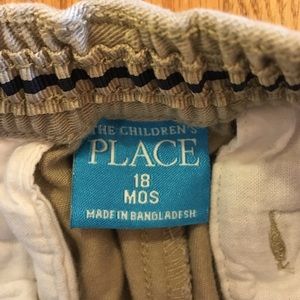 This 18 month two piece set includes Children's Place tan pants and Good Lad denim buttoned down shirt. Pants have side pockets and buttoned back pockets as shown and are made of durable, soft cotton. Excellent condition. Comes from a smoke free and pet free home.