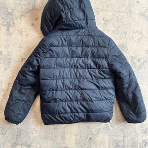 Boys Abercrombie winter jacket. Dark blue, hooded, size 7/8, zipper front closure, zipper side pockets, nylon and polyester, faux fur lining with recycled polyester. Light signs of use, overall great condition