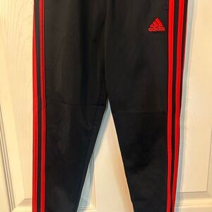 Boys Adidas black and red athletic pants - size 6. These pull-on pants are designed for active occasions such as play, school, basketball, and running. The jogger style offers a comfortable fit for athletic activities, making them ideal for young boys who enjoy staying active and engaged in sports or physical activities. Black with red stripes down the sides. Elastic around waist and tighter fit at ankles. Excellent condition!