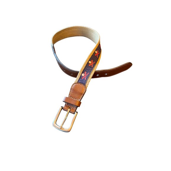This men's belt combines polyester and synthetic leather materials for durability and style. Featuring an embroidered golf-themed design, it adds a sophisticated touch to casual attire.