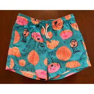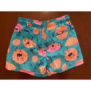 • Teal novelty print swim trunks featuring happy cartoon breakfast foods with drawstring waist-THIS ONE IS A HUSKY SIZE 8!