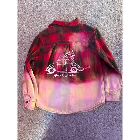 Adorable handmade red flannel, purposefully distressed and bleached with Christmas "Jingle All the Way" print on the back