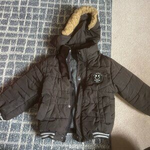 Cozy and functional boys brown puffer jacket with soft fleece lining and a detachable hood trimmed with faux fur. Features snap-close front pockets, full zip and snap front closure, and ribbed cuffs and hem for a secure fit.