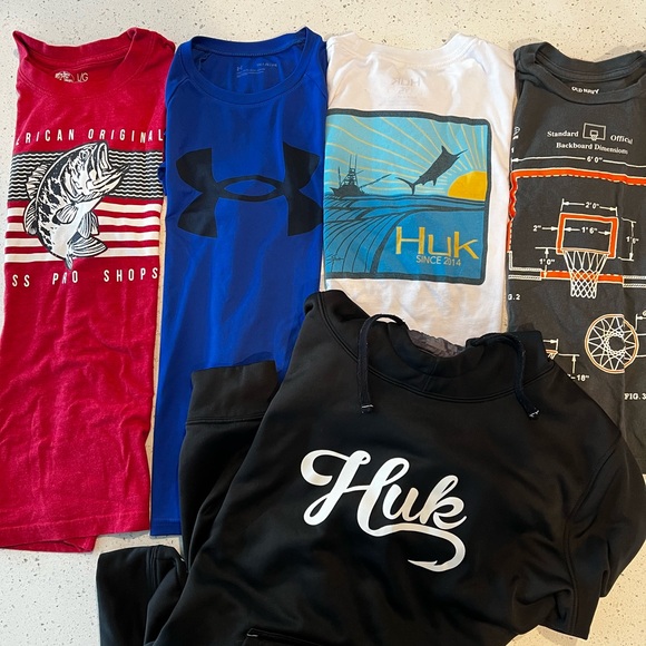 Assorted boys bundle. Brands HUK, Under Armour and Old Navy. Blue UA and red shirt are NWOT. Boys Size M/L bundle. Please see images for hole in hoodie and markings on the white shirt. Smoke free home and ships in polymailer.