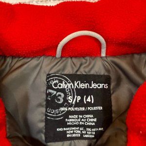 He will be warm and cozy for the cold-weather days in this hooded Calvin Klein Puffer Jacket. Features charcoal grey rain-resistant nylon exterior fabric, super-soft red fleece lining, zip & button closure at front, removable hood, button front pockets, ribbed cuffs and signature embroidered CK logo at left chest.