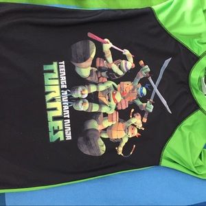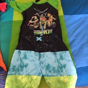 Excellent used condition boys' swim trunks in size M (ages 8-10). Can throw in matching Ninja Turtles rash guard (Nickelodeon) for free.