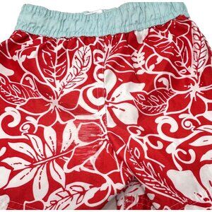 • Red & White Swim Trunks with White Mesh Lining, Light Turquoise Elastic Waist with Tie, White Leaf Design