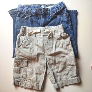 One long sleeve button down multi color plaid pattern Nautica shirt, size 4. 62% Cotton and 38% polyester. One Blue tones plaid pattern button down dress shirt from Nautica, size 4T made out of 55% cotton and 45% polyester. One pair of knee high short pants from Childrenswear size 4. One pair of denim jeans from Oshkosh B'gosh size 4T. One blush color, super soft long sleeve shirt from Children's Place size 4T made out of 60% cotton and 40% polyester.