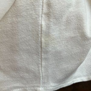 The thickness of this shirt is somewhere between a regular tshirt and a sweatshirt. It has a beautiful weave to the cotton. The last pic shows a small stain on the side seam. Please let me know if you have any questions!