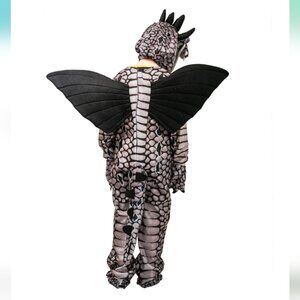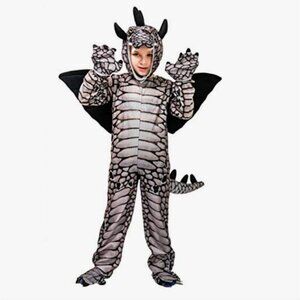 Let your child roar with excitement in the Dinosaur Costume. This black and white ensemble includes a full jumpsuit, feet and hand covers, mask that doesn't cover the face. perfect for Halloween or dress-up fun.