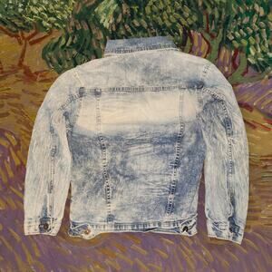 This is a cute, distressed denim jacket from Evolution in Design. It's in great condition, but does have some distressing and fading, which adds to the look!