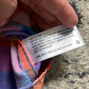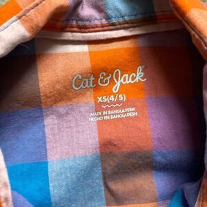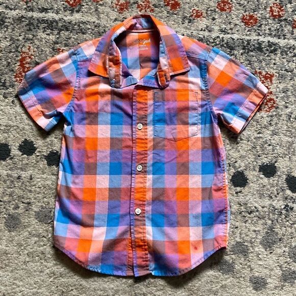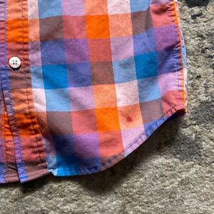 Details: Boys orange plaid button up ship with short sleeves. A cute farmer type shirt that could be worn for pumpkin patches or other fall activities. There is a small red stain on the bottom of the shirt, see pictures.