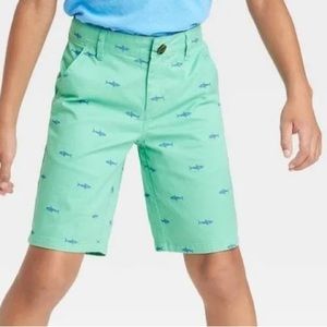Boys' Flat Front 'At The Knee' Chino Shorts Green with blue sharks