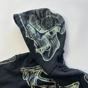 Skeleton graphic on the front, arms, and back, skull design on both sides of the hood
