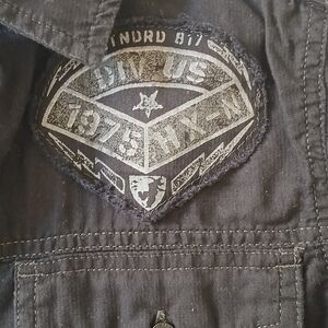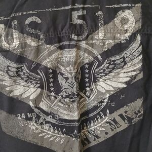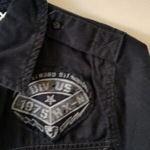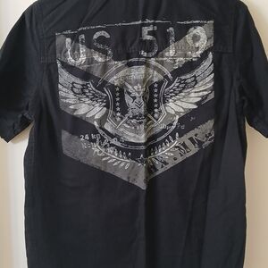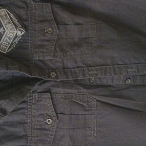 Pre-owned good condition button-down shirt with button straps on the shoulders and two front chest pockets with button closure