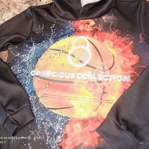 Blue boys conscious collection basketball multicolor fire and ice hoodie featuring a vibrant multicolor design. Includes a unique graphic with text 'Conscious Collection'. smoke free pet free home boys size large