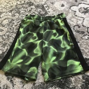 Vibrant green and black athletic shorts w/ elastic waist, two deep front pockets.