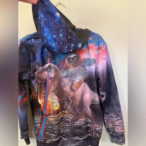 Boys Large Sloth and Dinosaur in Space Funny Pullover Hoodie Hooded Sweatshirt