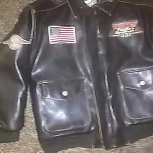 Warm insulated bomber jacket comes with all the bells and whistles - in the patches world! Huge aviator patch on back. Jackets leather and patches look slightly distressed for that authentic vintage look!