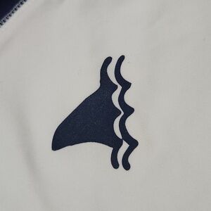 Navy raglan sleeves with shark fin graphic on the chest coordinates with a variety of swim trunks